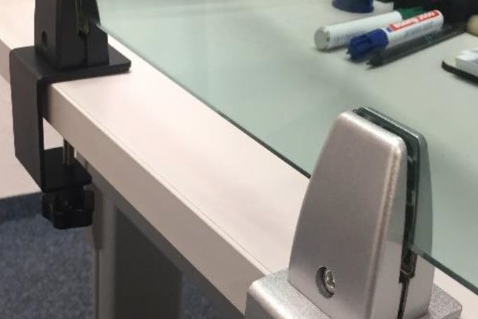 Ab heute können wir Ihnen verschiedene Varianten zur Befestigung Ihres Thekenaufstellers/Hygieneschutzes anbieten. Im Beispiel links abgebildet: Klemmhalterung aus Metall, grau…